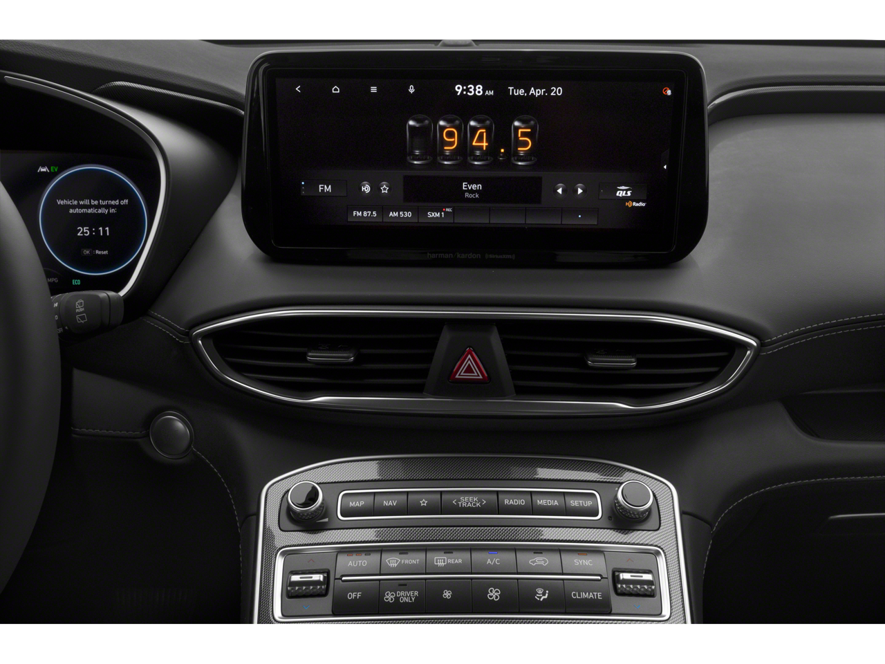 - Radio: AM/FM Harman Kardon Audio -inc: 10.25" wide touchscreen, Apple CarPlay and Android Auto, Bluetooth® hands-free w/wireless audio streaming, dynamic voice recognition, USB ports, SiriusXM, HD Radio, Blue Link connected car system, 12 speakers including subwoofer, external amplifier, Clari-Fi music restoration technology, QuantumLogic surround, navigation system including traffic flow w/incident data via HD Radio (HERE), OTA updates (map only), rear seat quiet mode and steering wheel audio and phone controls